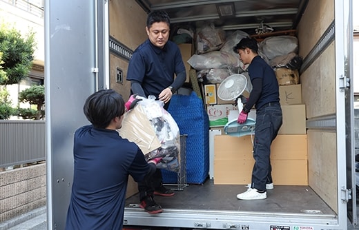 パートナーズのゴミ屋敷片付け・汚部屋片付けでは、貴重品類を探索しながら不用品をリユース・リサイクル可能なもの、廃棄するものなどに手早く仕分けます。仕分け後は回収する不用品を速やかに搬出してトラックに積み込みます。
