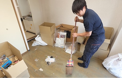 ゴミ屋敷片付け・汚部屋片付けをご依頼いただいた大阪のお客様に心からの感謝の気持ちを込めて、不用品搬出後にホウキで掃き掃除を実施します。簡易的ですが床などに残ったチリやホコリを丁寧に取り除いてすっきりさせてからゴミ屋敷片付け・汚部屋片付けの作業内容をご確認いただきますよ。