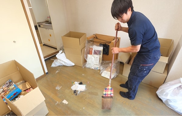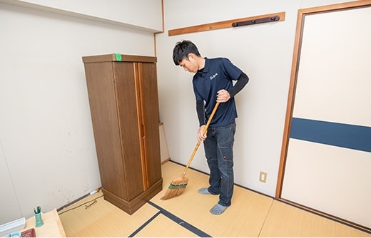 埼玉県坂戸市のゴミ屋敷専門パートナーズでは、ゴミ屋敷片付け・汚部屋片付けをご依頼いただいた埼玉県坂戸市のお客様のために、作業の仕上げに心を込めて掃き掃除を実施しています。ささやかなサービスですが、床などに残った細かいチリやホコリをホウキで丁寧に取り除いて可能な限りキレイな状態に整えます。