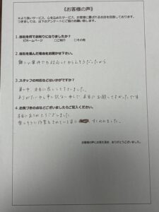 作業後には「暑い中、本当に良くしてくださいました。新居に持っていく物と処分する物が混在している状態で申し訳なかったのですが、重要そうなものや気になる物を逐一確認して対応してくださり助かりました。また、スタッフの方々が楽しそうに作業をされる姿に救われました。本当にお願いして良かったです。」と、お客様にとても満足していただき、とても嬉しく思います。