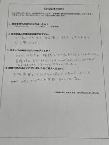 作業完了後には、『とてもテキパキ確認しながら対応してくれました。やはり、それなりの金額なってしまいましたが、かなりわがままを聞いてくださり、とても綺麗になりました!本当にありがとうございました!』とご満足頂くことが出来ました。