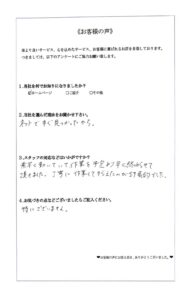 - A素早く動いていて作業を予定より早く終わらせて頂きました。丁寧に作業してもらえたのが印象的でした。