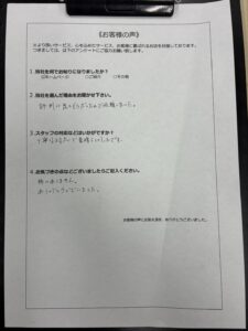 作業後には「不要なものはすべて回収してくださって、探していた貴重品も見つけていただき大変助かりました。見積もりの方、作業の方どちらもすごく丁寧な対応で素晴らしかったです。」と、大変嬉しいお言葉をいただきました。