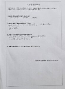 最後にお客様から「本当に助かりました。」とほっとした様子でお声がけいただき、我々スタッフ一同もお引越しまでに作業が間に合いとても安心いたしました。