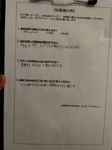 作業完了後には、「見積もりから作業まで丁寧な対応して頂き一日で作業が終わりました。対応が早いのと外出中に進めてくれたのでとても助かりました。ありがとうございます。」と、大変ご満足いただくことができました。