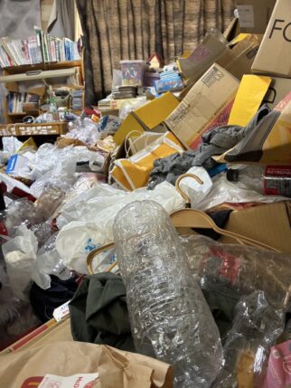 当日は、3LDKの一部屋を2トンショート車1台、作業員4名、4時間の作業でお片付けを行いました。お部屋は膝下ほどまで空のペットボトルや缶、段ボールなどの生活ゴミが多く、堆積している状態でした。また、家財を中心に2段ベッドのフレームや勉強机、袖机、テレビなどは残されるご希望でしたので、それ以外を全て処分として対応いたしました。仕分けと3階からの運搬、積み込みをそれぞれ2名ずつの少人数での対応でしたので、まずはお荷物をまとめて置けるスペースを確保し、一気に全員で運びました。最後には、簡単な掃き掃除と掃除機を使ってカーペットと壁のお掃除をいたしました。