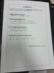お客様からは「電話対応から作業完了まで大変素早く丁寧に対応いただきました。類似の業者もいくつか検討しましたが、ホームページと電話対応が分かりやすく丁寧で一番良かったです。」と、お褒めの言葉をいただきました。