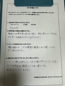 作業後には『嫌な顔せず、こちらの要望も親切になって聞いて頂き助かりました。一つ一つ分別して頂き、有難う御座いました。』と嬉しいお言葉を頂きました。
